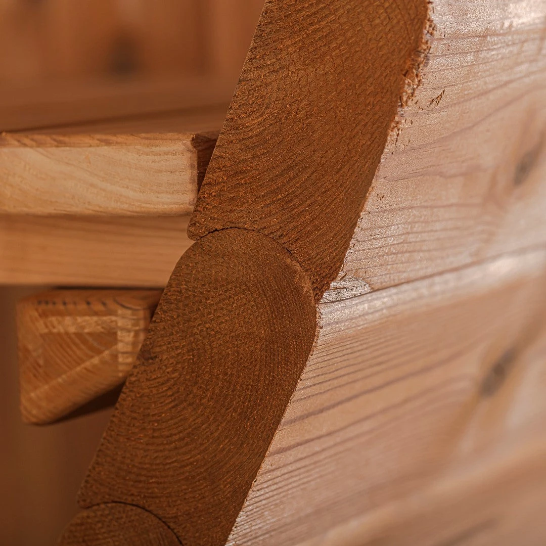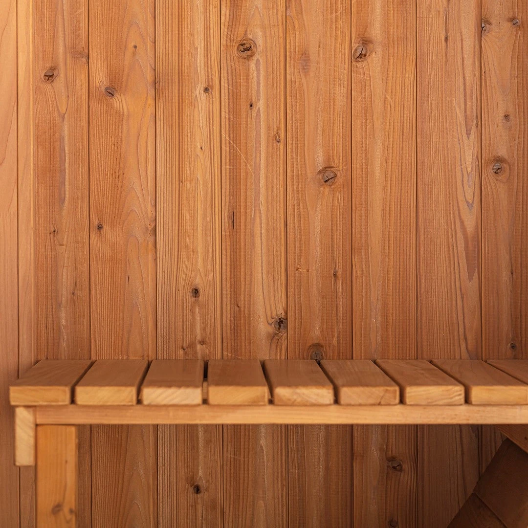 Traditional barrel design provides structural integrity and minimal maintenance, with the curved build naturally shedding water and snow. Roof shingles act as protective shields from the elements, ensuring lower energy bills and a potential bump in your property’s value. Barrel saunas also provide an extra layer of efficiency, less power is needed to heat the room due to minimal unused airspace, while the thick staves are excellent insulators.