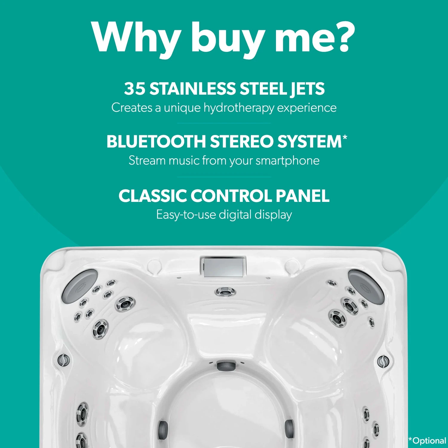 - 35 hydromassage jets and 3 cosy integrated pillows