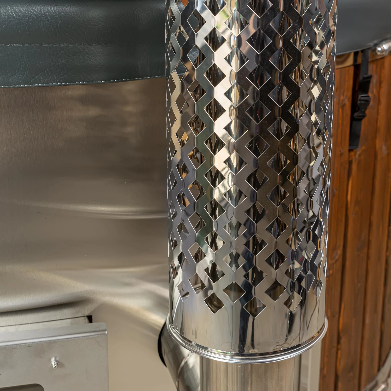 This elegant wood fire hot tub is a premium build, from its sleek white inner shell to the spruce wood trim and matching bespoke two-tiered steps. The wood has been pre-treated, too, to prevent rotting and to increase its lifespan. Two LED lights illuminate your bathing space so you can take your soak into the evening or simply guide yourself in. Plus, you can be sure of your safety with the chimney heat guard.